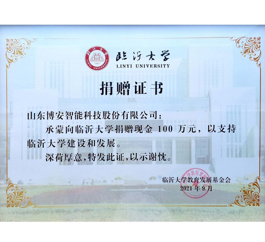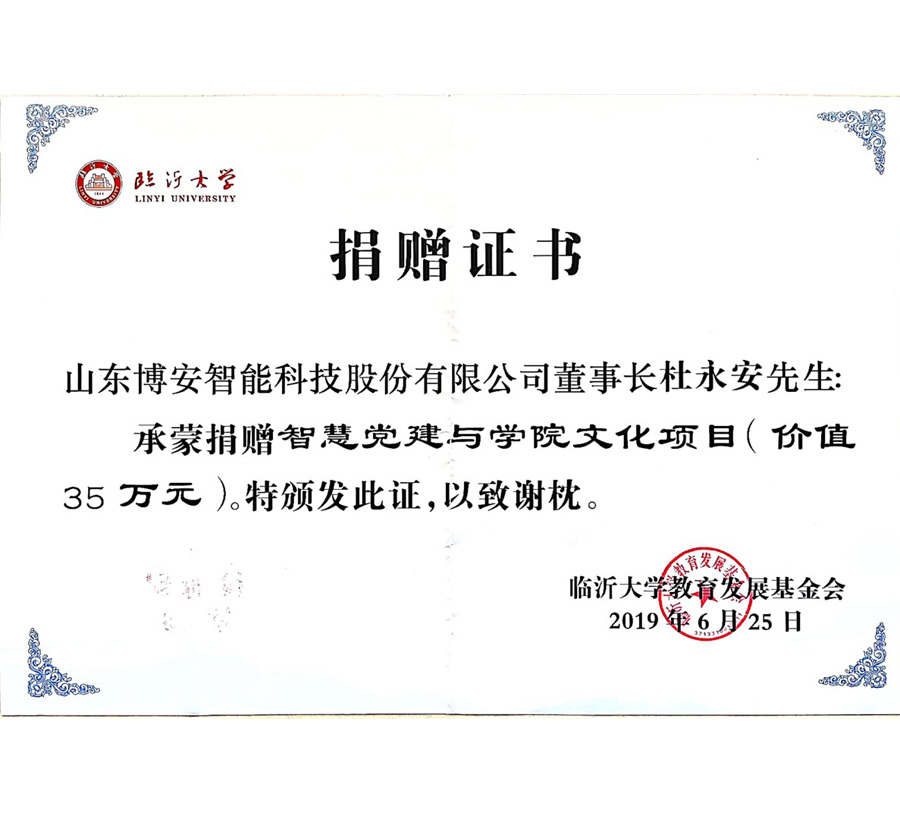 2019臨沂大學(xué)捐贈證書-智慧黨建與學(xué)院文化項(xiàng)目35萬元設(shè)備